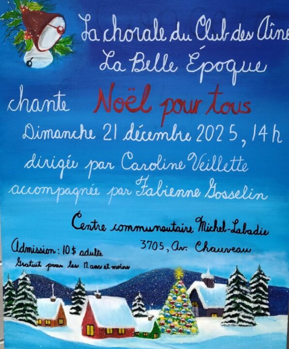 C’est avec plaisir que nous vous invitons à notre concert de Noël. Les billets sont en vente, vous pouvez passer au bureau du club du lundi au jeudi de 10 h à 12 h et de 13 h à 15 h. Vous pouvez aussi les acheter le même jour du concert à la salle Denis-Picard. Alors, pour le coût de 10 $ et c’est gratuit pour les enfants de 12 ans et moins. Vous allez avoir l’occasion de participer au concert et d’apprécier les belles toiles artistiques réalisées par nos membres qui sont inscrits au cours de Dessin-peinture.